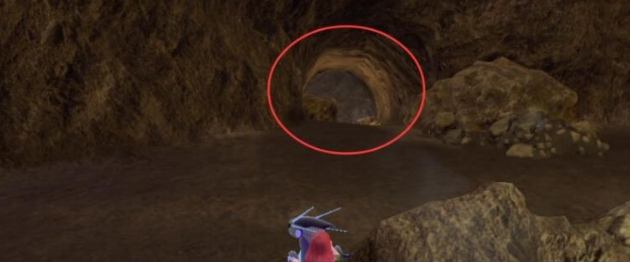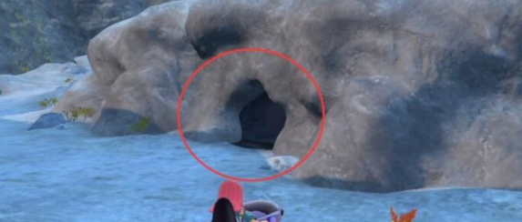 2.抵达坐标点后沿岩壁向西北方移动,注意观察地面红色矿物沉积带。穿过两处瀑布景观后,在生长着发光苔藓的山坡背面可发现隐蔽入口。