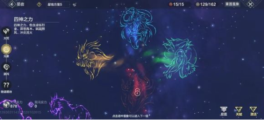 本次更新对元素属性体系进行重构,原星宿提供的单一元素加成统一转化为大荒属性。玩家现可通过专属元素星宿界面定向激活特定元素增益,界面布局经过全面优化,操作路径缩短至两步:点击左侧导航栏或滑动右上角切换面板即可直达元素星宿模块。