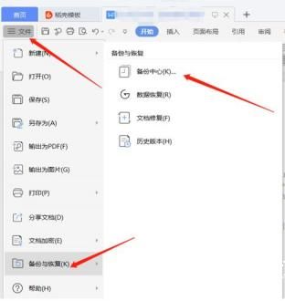 1. 启动WPS软件后定位至界面左上角,点击文件菜单展开功能列表。在二级菜单中找到"备份与恢复"模块,该模块整合了文档管理的核心功能。