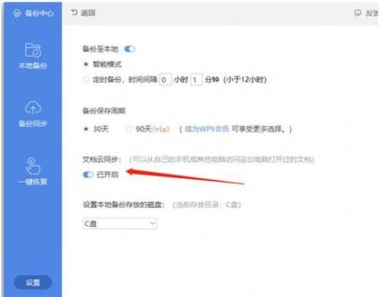 2. 进入备份中心界面后,注意窗口顶部的功能导航栏。点击设置图标进入参数配置界面,在同步设置板块找到"文档云同步"开关。启用该功能后,软件界面右上角将出现云朵状态标识,实时显示同步进度。