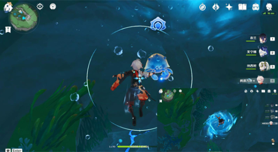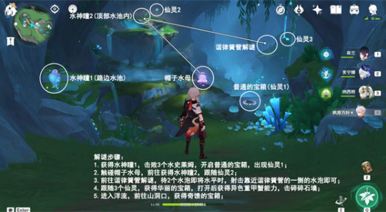 6、跟随三个仙灵移动时需注意氧气条消耗,建议提前装备「浪船」相关续航道具。当仙灵归位后,水池底部将显现华丽宝箱,开启时将触发特殊战斗事件。