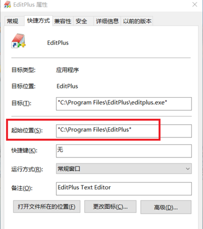 2、在桌面快捷方式图标处右键调出属性面板,通过目标路径定位程序安装目录。对于Windows 10/11系统用户,可尝试在开始菜单搜索框输入"EditPlus"直接右键打开文件所在位置,快速跳转至安装文件夹。