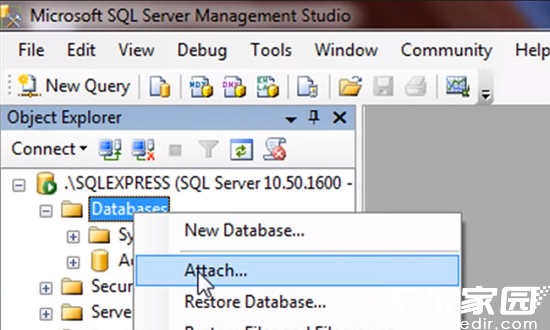 1、启动Microsoft SQL Server Management Studio后,在对象资源管理器界面左侧找到"数据库"节点。右键点击该节点选择"附加"功能项。注意:为确保系统权限正常,建议使用管理员身份启动应用程序。