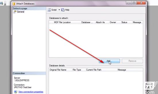 2、在弹出的数据库附加对话框中,点击"添加"按钮进入文件选择界面。此步骤需准确定位目标文件所在存储路径,建议提前整理好文件目录结构。