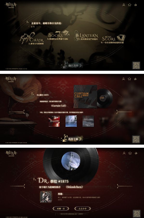 本次音乐主题互动采用多维度选择机制,玩家通过个性化选项组合将生成专属心灵乐章。系统会根据决策路径智能匹配塞壬唱片库中的精选曲目,每次交互都将影响最终生成的音乐篇章。